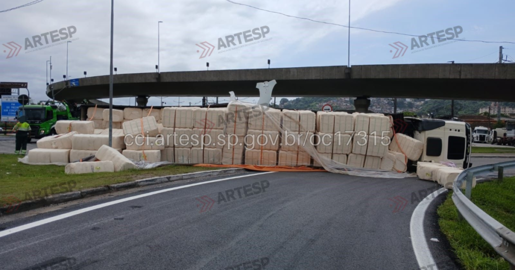 Uma carreta interditou a Rodovia Anchieta após perder o controle ao fazer uma curva e tombar em Santos, litoral paulista, na manhã deste sábado (22). Uma pessoa ficou levemente ferida.