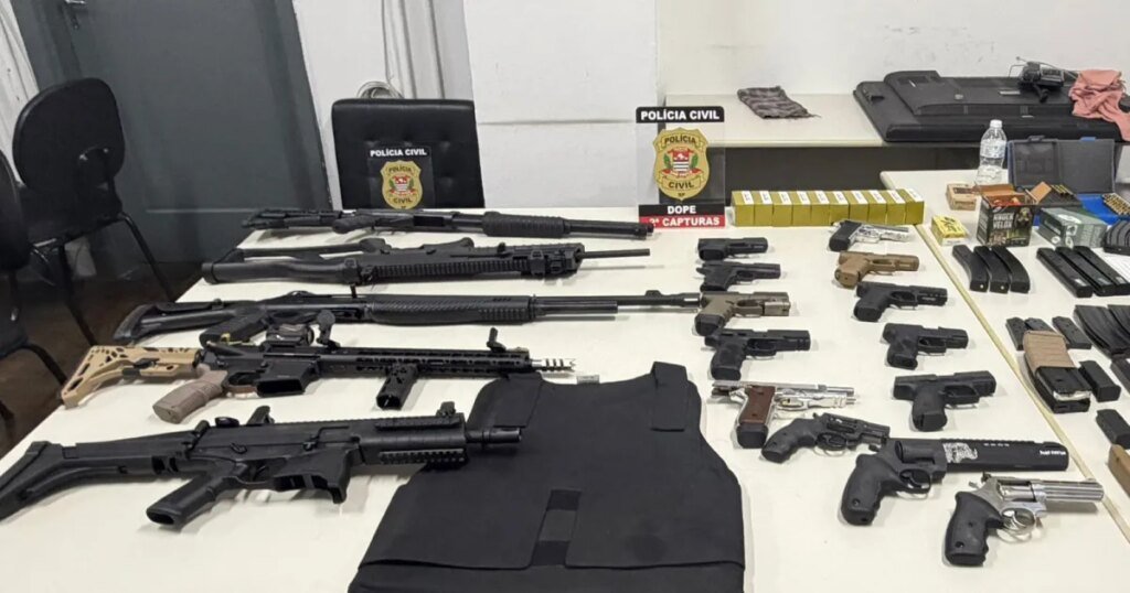Com ele, foram encontradas mais de 18 armas — entre pistolas, revólveres, espingardas, carabina, submetralhadora e fuzil —, além de 32 carregadores, 15 registros, 12 cópias de documentos e centenas de munições de diversos calibres.