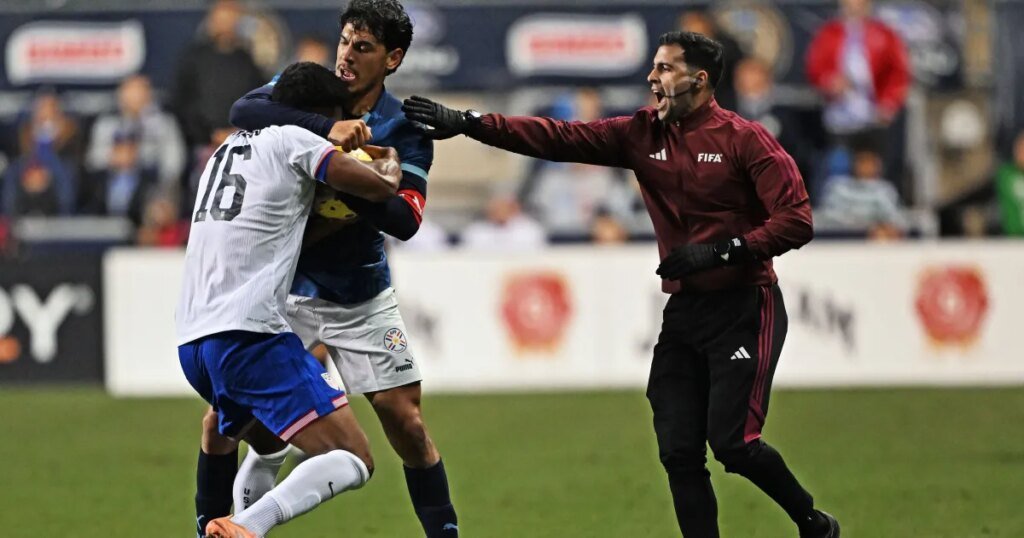 Gustavo Gómez, zagueiro do Palmeiras, iniciou uma confusão generalizada durante o amistoso entre Estados Unidos e Paraguai na noite deste sábado (15), na Filadélfia.