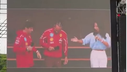 Os pilotos da Ferrari acompanharam os movimentos mostrados pela apresentadora do evento, com o monegasco se empolgando mais na dança, enquanto era observado por um Lewis sorridente.