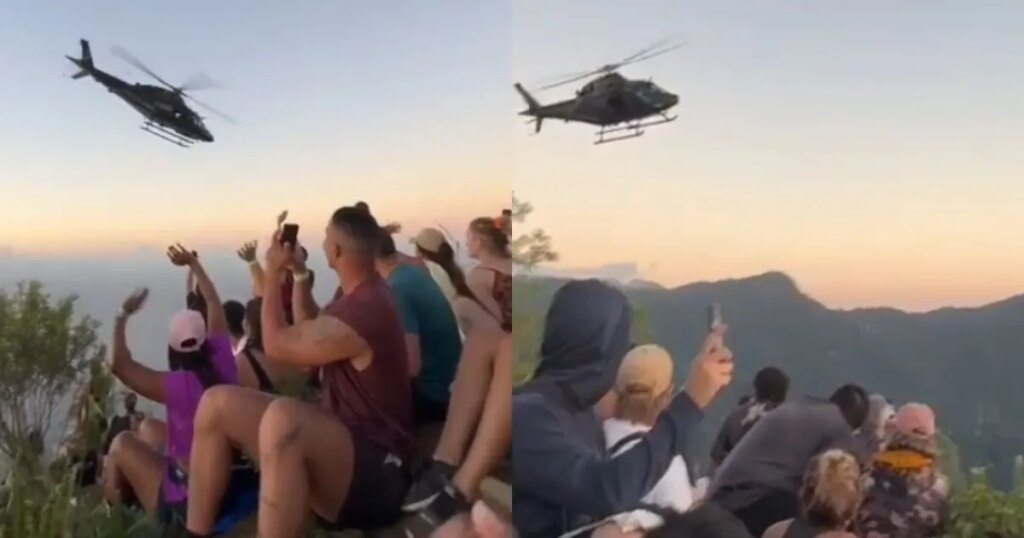 No topo da comunidade, um grupo de turistas ficou ilhado em um mirante devido ao risco provocado pelos disparos e ao bloqueio dos acessos.