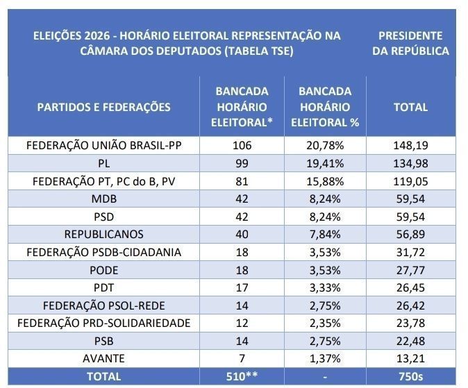Pelos dados, a federação entre União Brasil e PP deve liderar com cerca de 20,78% do tempo de propaganda.